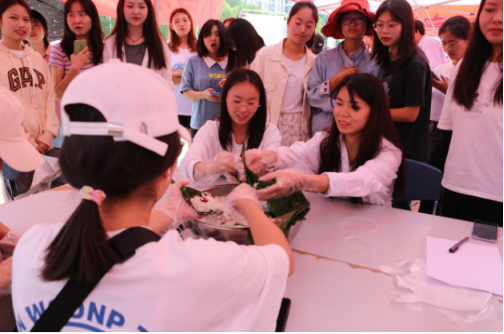 同时,令人兴奋的包粽子环节也在气氛热烈地进行着。同学们以四人为一组,开始了激烈的包粽子比赛。青绿的粽叶、雪白的糯米在他们手中瞬间变成了一个个可爱的粽子。路过的同学们看到了,都踊跃报名参与,场面热闹不已。